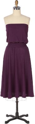 This eggplant strapless dress from C&C California. It draps around the midsection so that helps camouflage my mommy belly that's now going on two years old:) plus C&C's cotton is so comfy and cool I would put on some beads around my neck my thin silver hoops and be done!